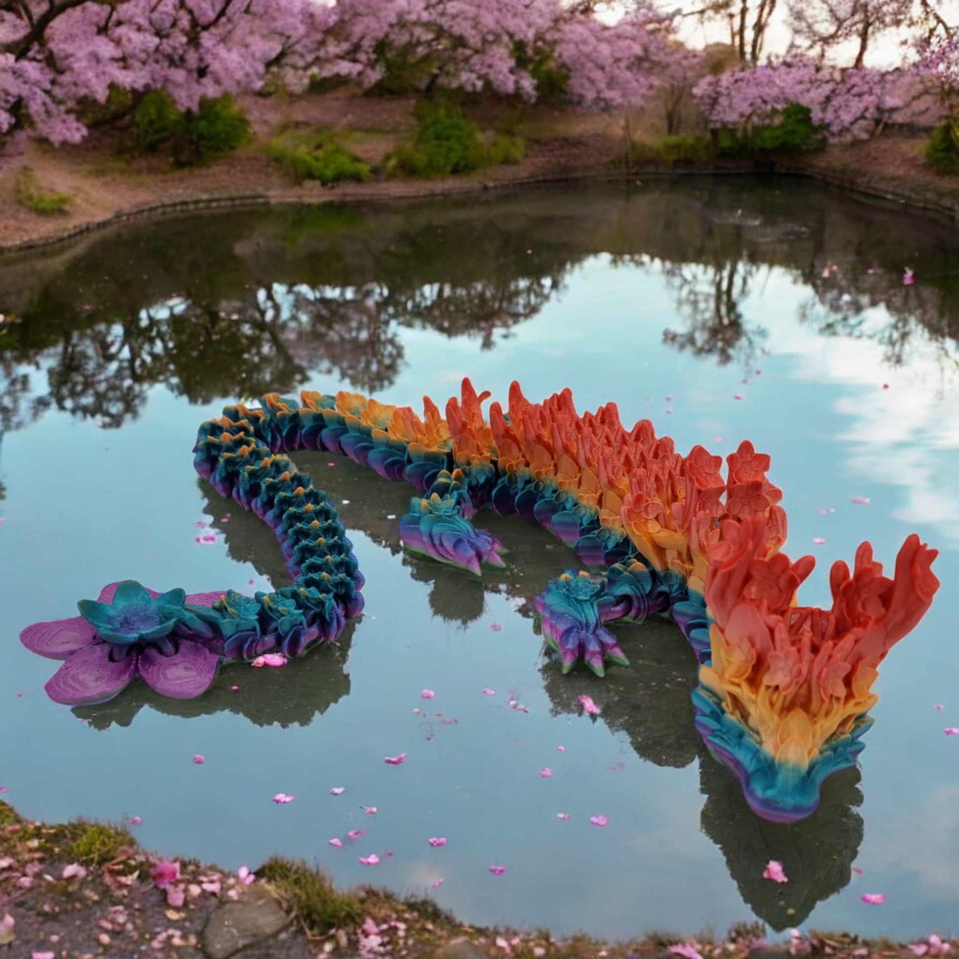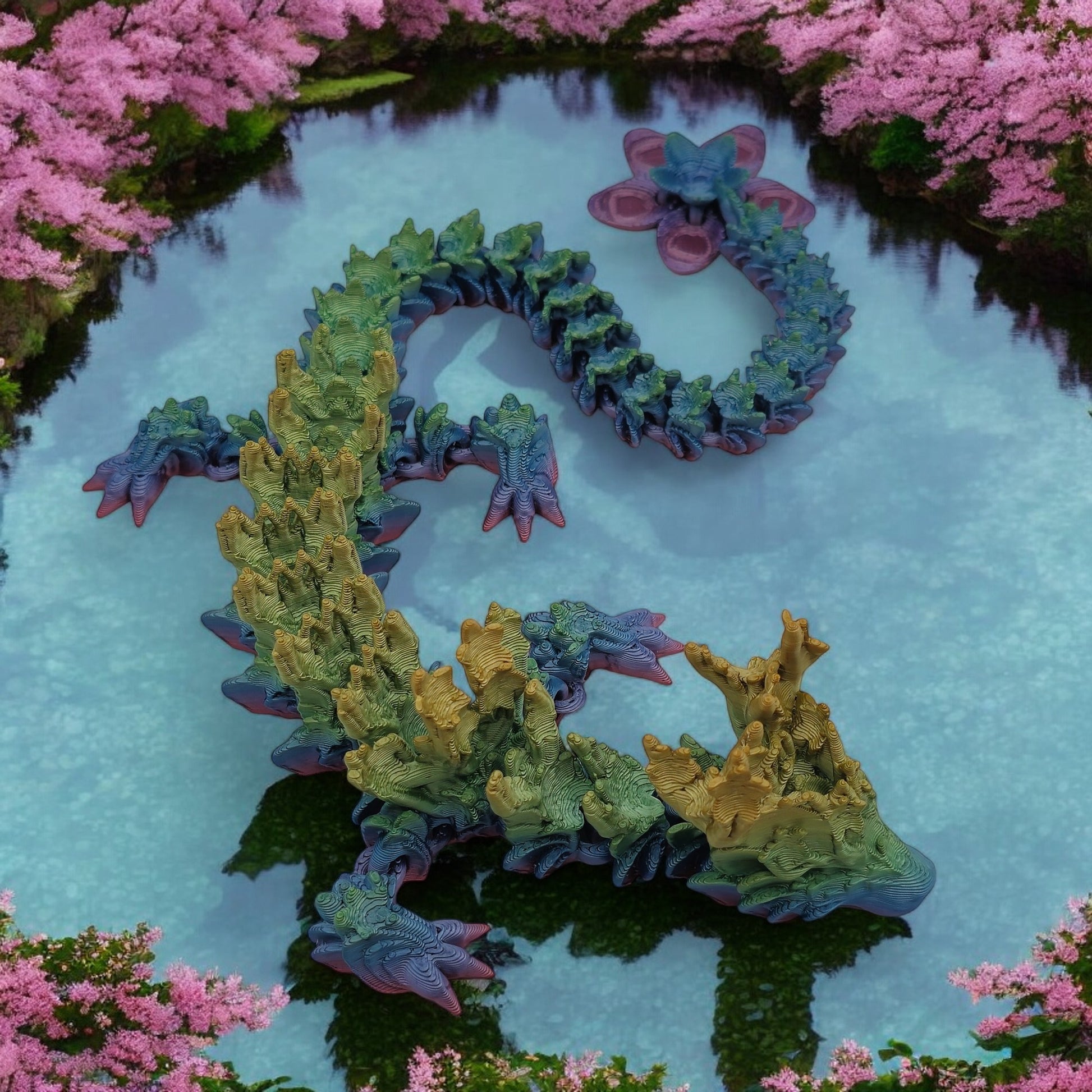 Standing 18 inches tall, this breathtaking collectible captures the grace and renewal of spring with petal-inspired details and a serene, flowing design. With intricate scales and a peaceful presence, it brings natural beauty and fantasy elegance to any collection. Choose from Warm, Cool, Neutral, or Rainbow Gradient color styles — each uniquely blended for a one-of-a-kind look.