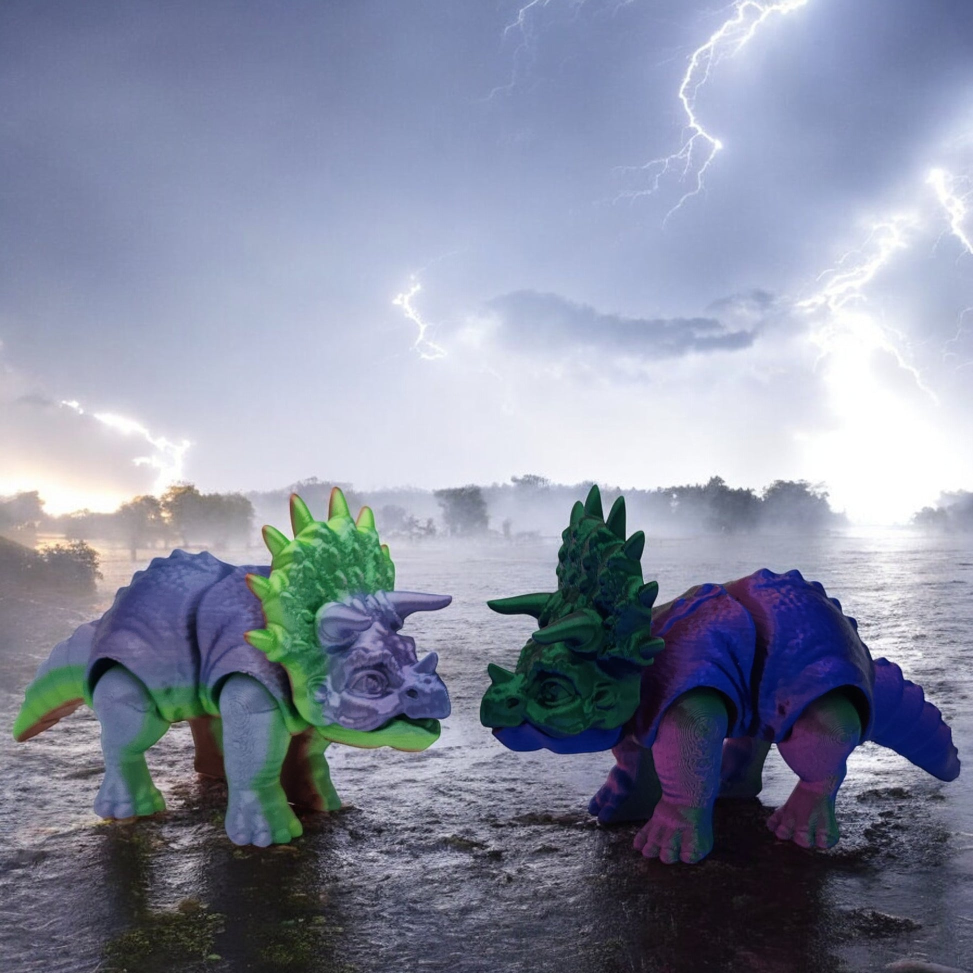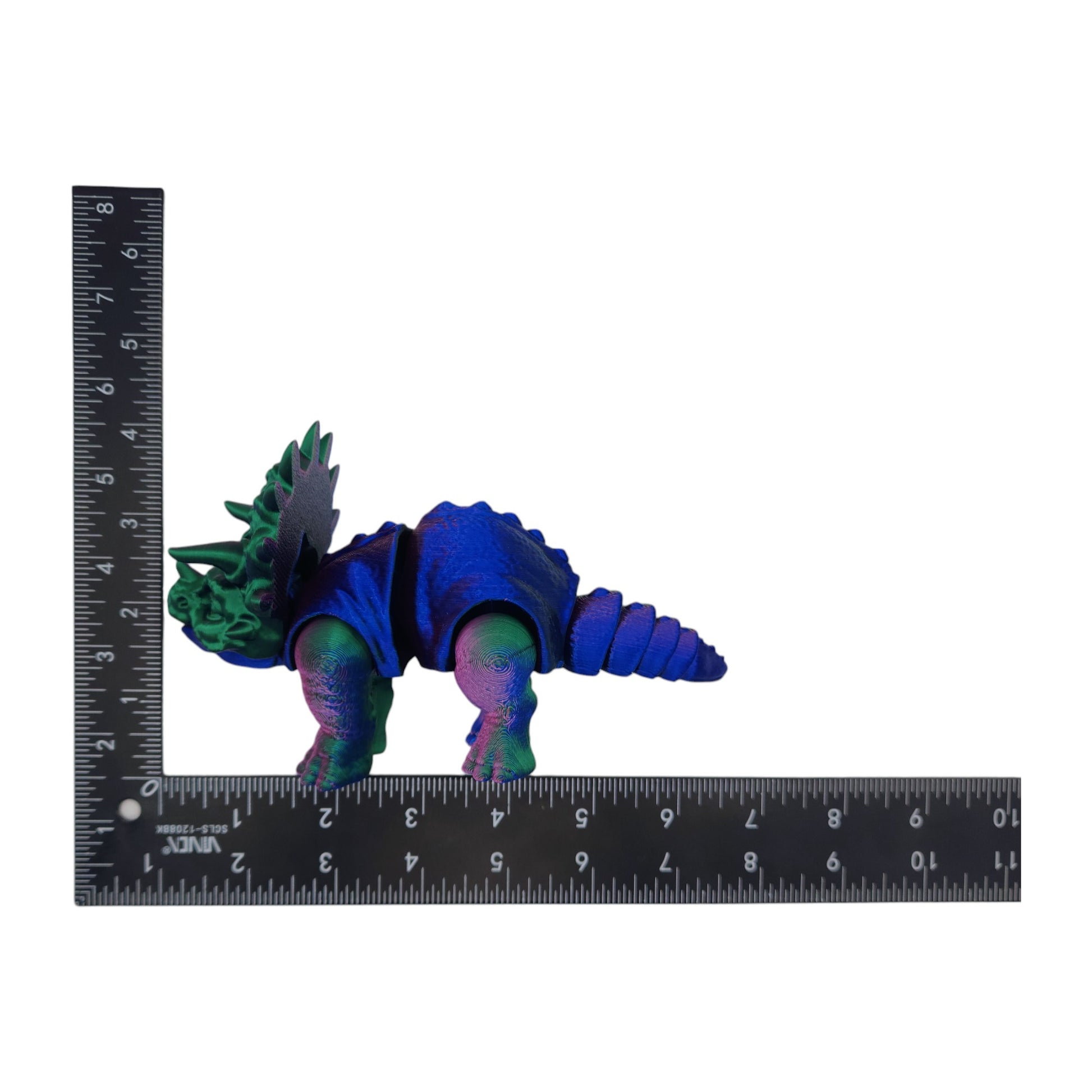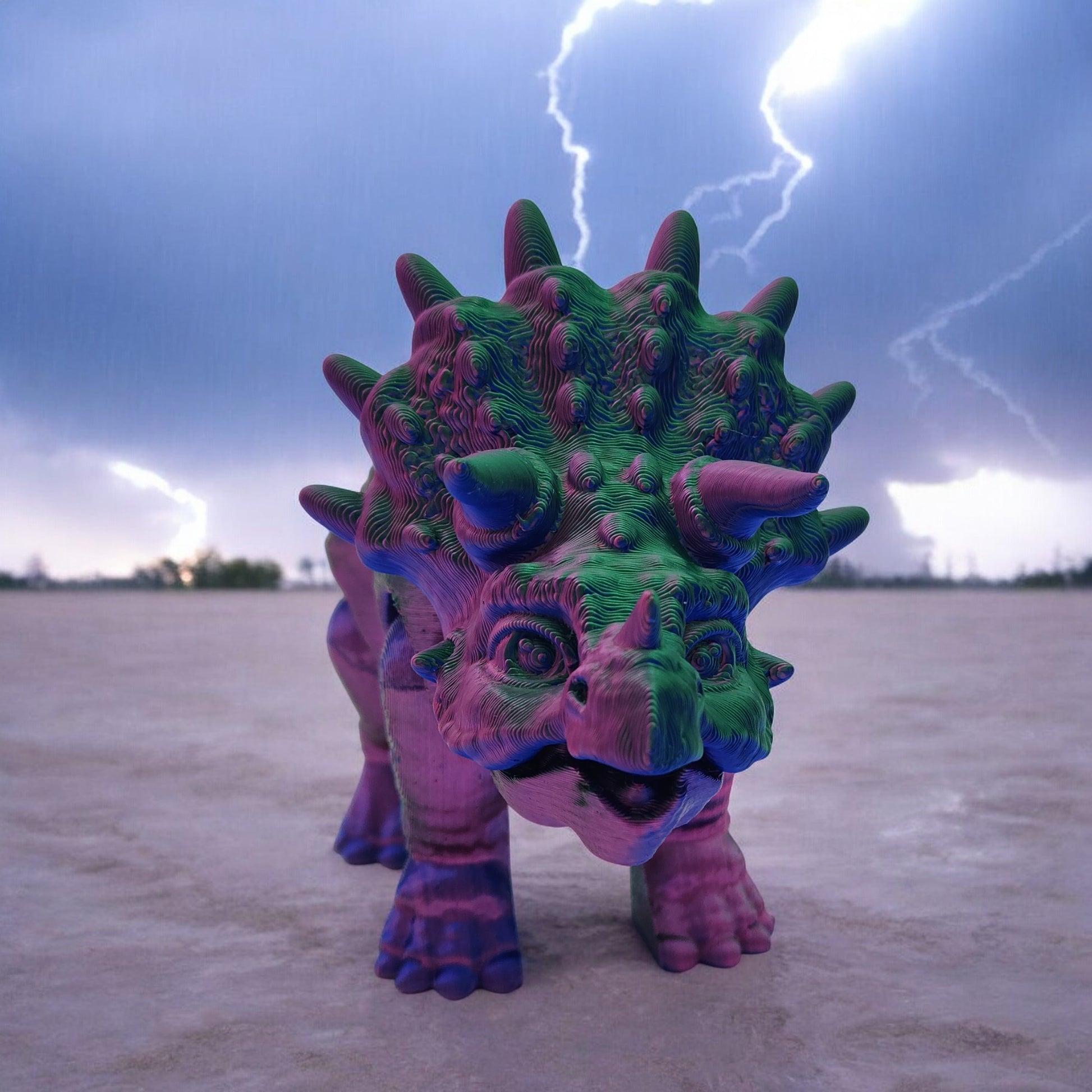 Standing 6.5 inches tall, this powerful collectible captures the strength and majesty of the iconic three-horned dinosaur. With a detailed frill, sturdy horns, and a bold stance, it brings prehistoric might to any collection. Choose from Warm, Cool, Neutral, or Rainbow Gradient color styles — each uniquely blended for a one-of-a-kind look.