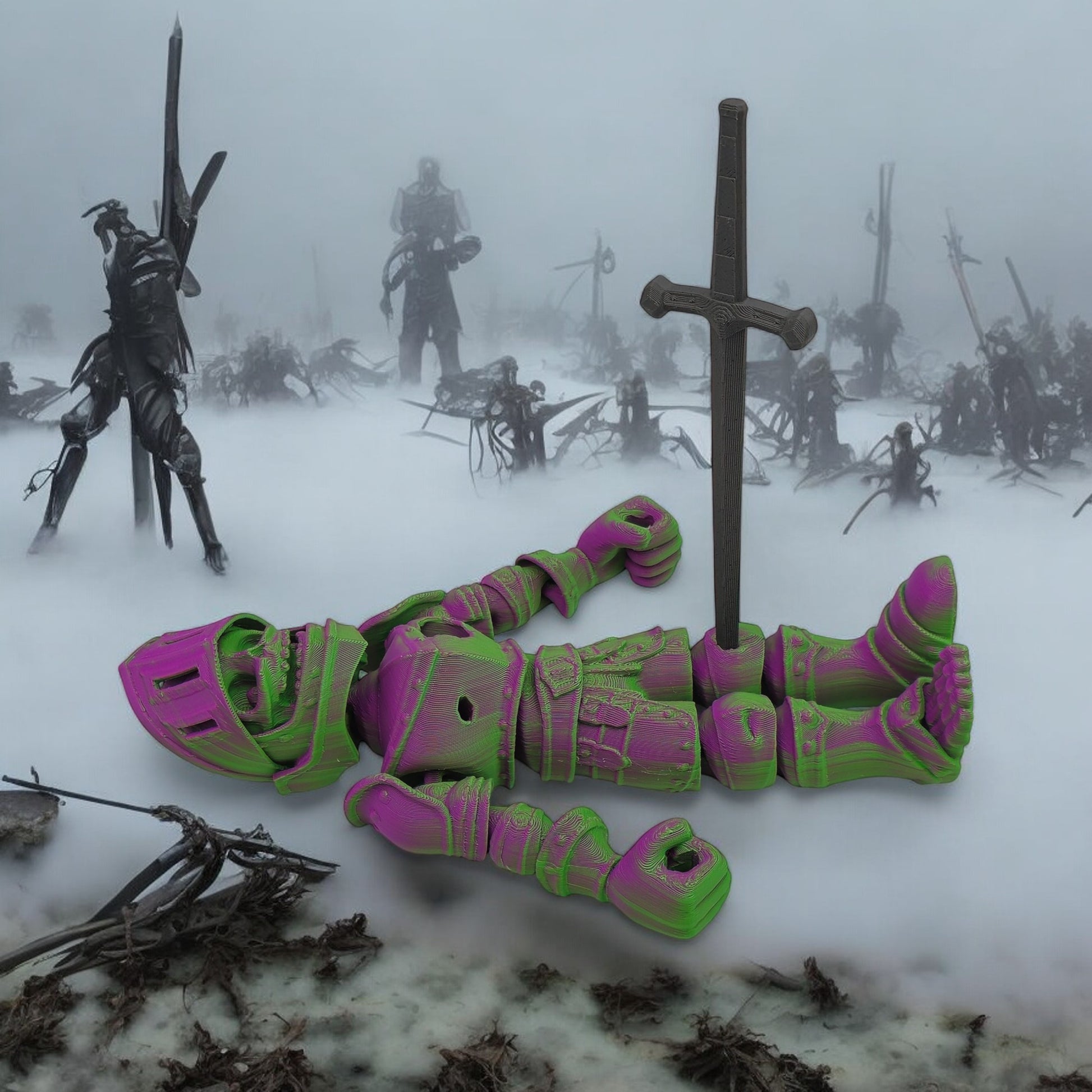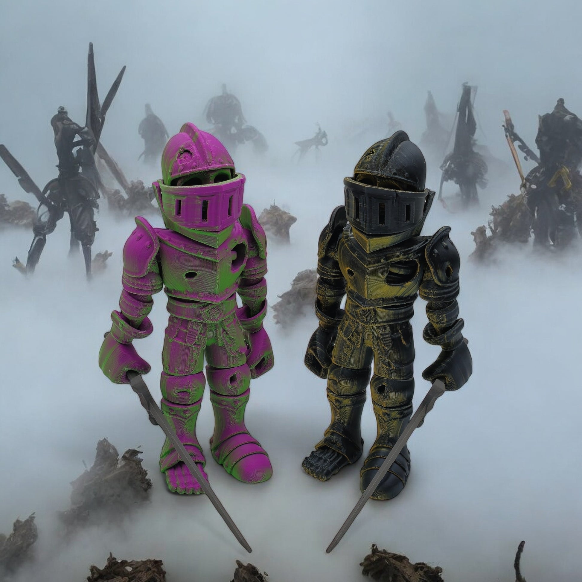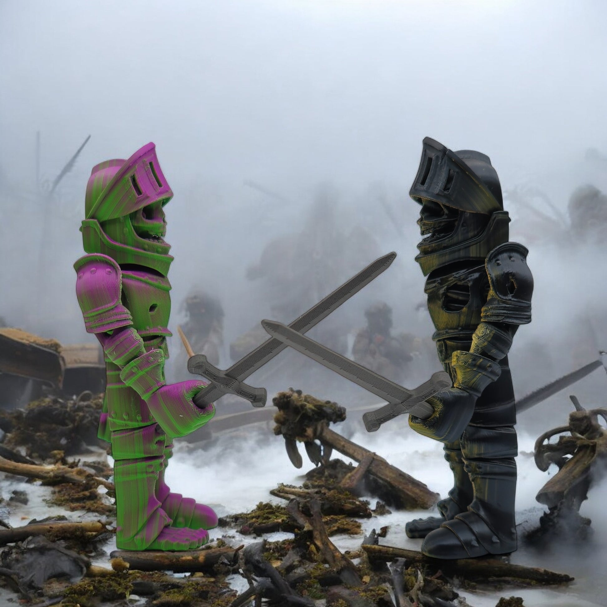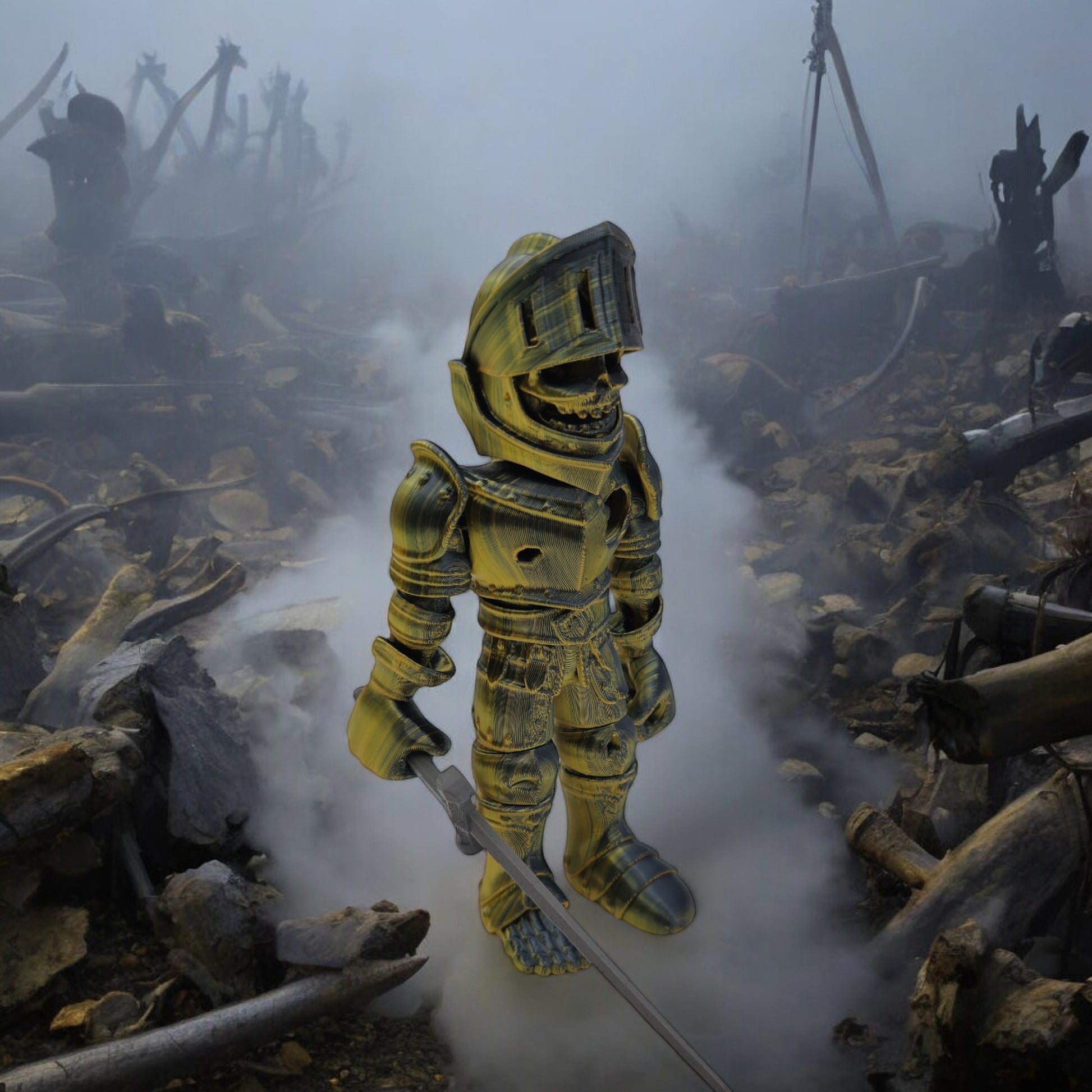 Standing 8 inches tall, this haunting collectible merges the eerie allure of a skeleton with the valor of a medieval knight. With detailed armor and bone craftsmanship, it brings a ghostly, heroic presence to any display. Choose from Warm, Cool, Neutral, or Rainbow Gradient color styles — each uniquely blended for a one-of-a-kind look.